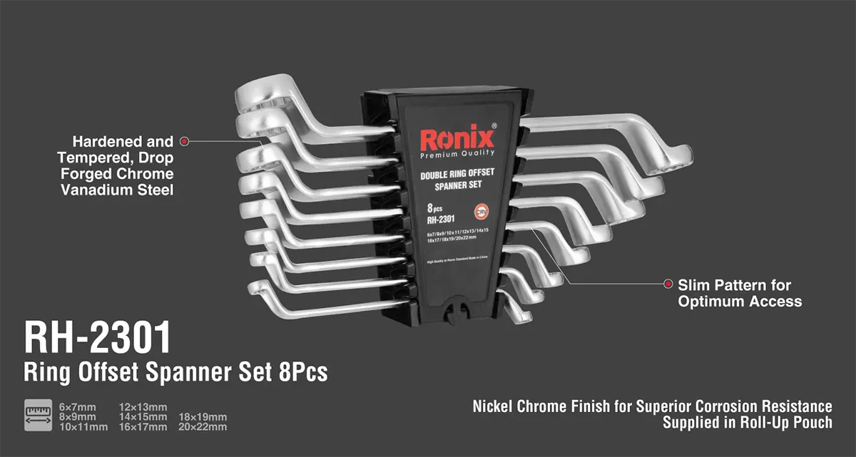 ست آچار دو سر رینگ رونیکس RH-2301 شامل 8 عدد آچار در سایزهای میلیمتری پرکاربرد است که طیف وسیعی از نیازهای تعمیراتی را پوشش میدهد. هر آچار دارای دو سر با سایزهای متفاوت است که تنوع کاربری را افزایش میدهد. سایزهای موجود در این مجموعه عبارتند از: