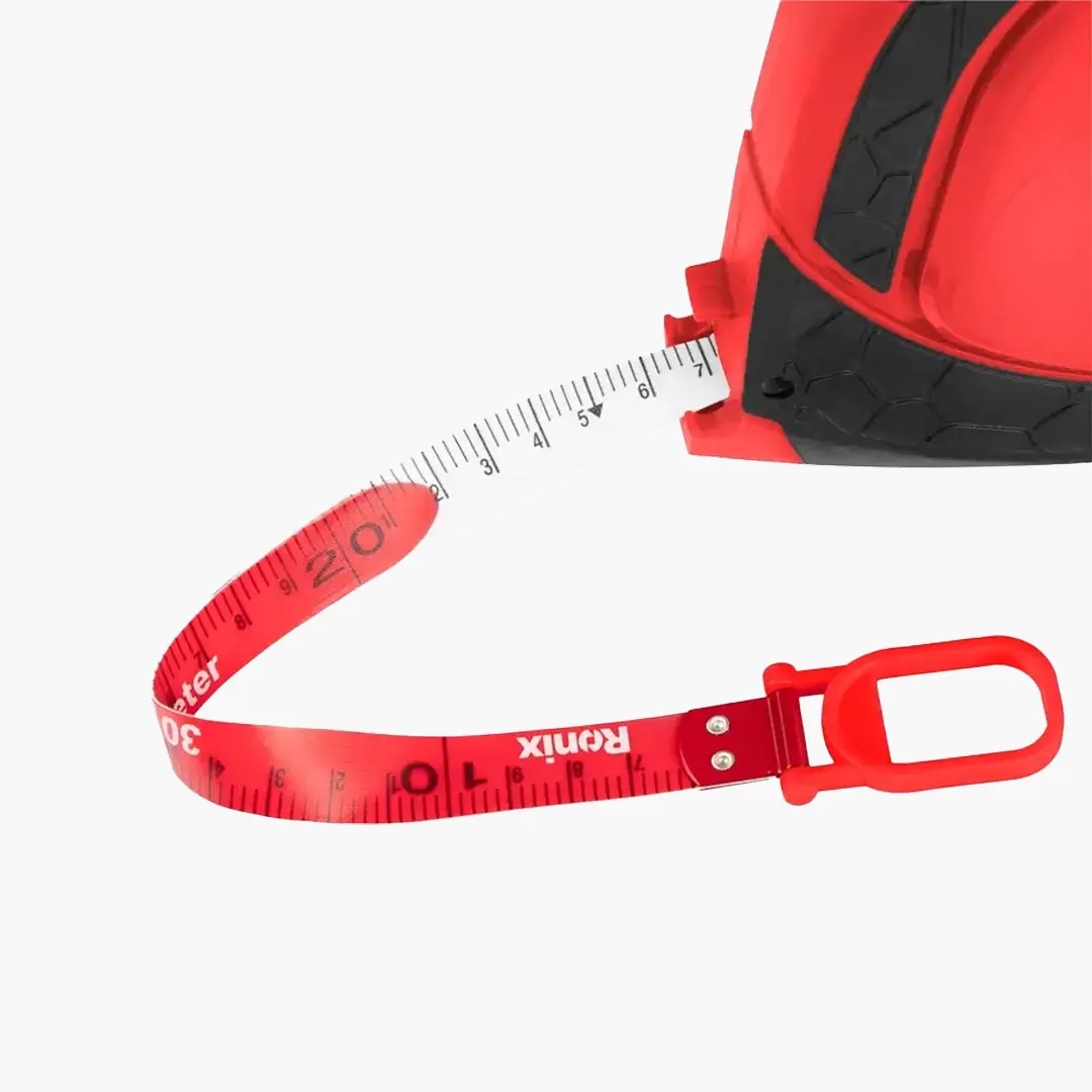 یکی از چالشهای مترهای متراژ بالا، زمانبر بودن جمع کردن آنهاست. مدل RH-9803 رونیکس مجهز به دستهای با مکانیزم روان است که جمع کردن 30 متر نوار را در کمترین زمان و بدون گیر کردن امکانپذیر میسازد. این سیستم از پیچخوردگی نوار داخل محفظه نیز جلوگیری میکند.