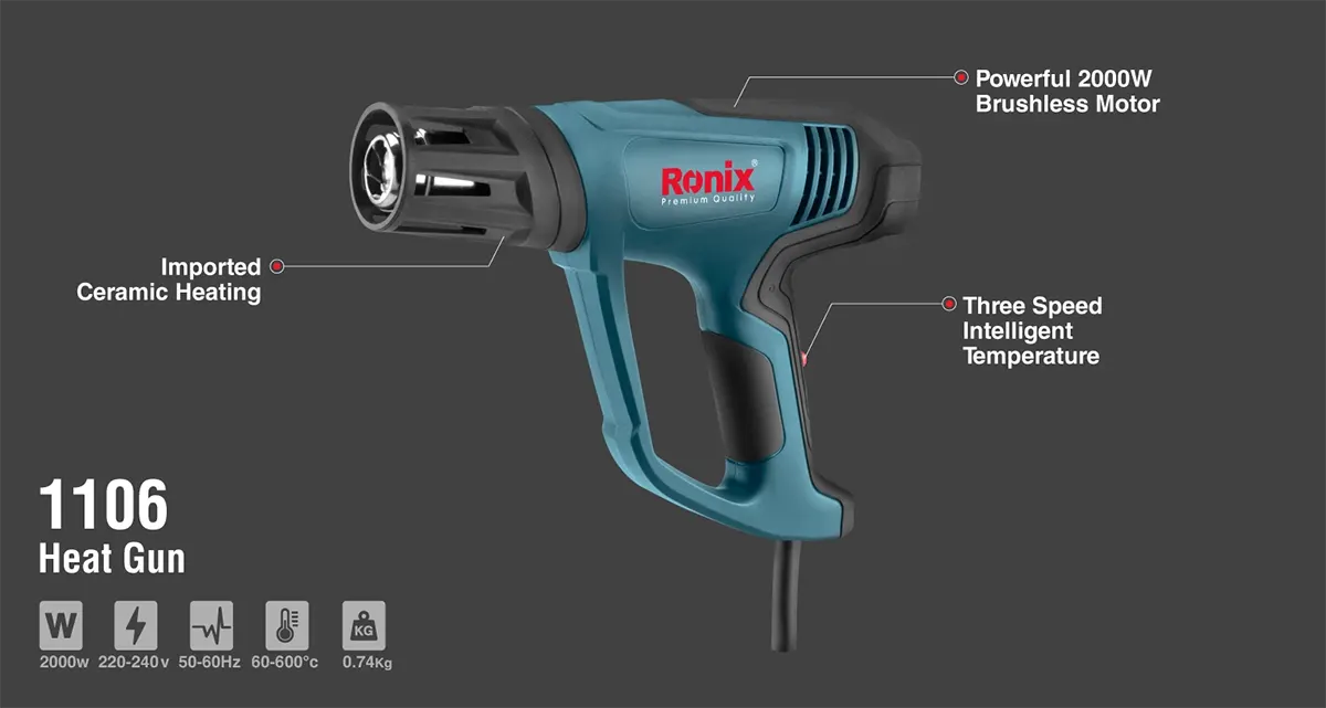 مدل 1106 رونیکس صرفاً یک دمنده هوای داغ نیست؛ بلکه ابزاری مهندسی شده برای انجام کارهایی است که نیاز به دقت حرارتی دارند. برخلاف سشوارهای خانگی، این ابزار برای کارکردهای طولانی و تحمل دمای بسیار بالا طراحی شده است. استفاده از متریال باکیفیت در ساخت بدنه و قطعات داخلی، طول عمر بالای این دستگاه را تضمین میکند.