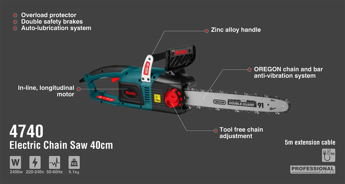 کار با اره زنجیری همواره نیازمند رعایت اصول ایمنی است. رونیکس در مدل 4740 با بهکارگیری تکنولوژیهای روز، استانداردهای ایمنی را به سطح جدیدی ارتقا داده است.