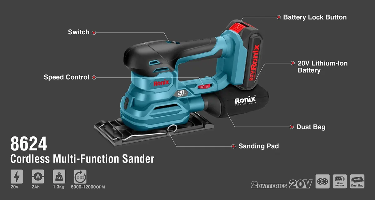 مدل 8624 رونیکس فراتر از یک سنباده معمولی است. این دستگاه با طراحی “سه در یک” (3in1) به کاربر اجازه میدهد تا با تعویض سریع کفی، ماهیت دستگاه را تغییر دهد. چه در حال سنبادهزنی سطوح وسیع باشید، چه نیاز به پرداخت گوشههای تیز داشته باشید و چه بخواهید سطوح منحنی را صاف کنید، 8624 پاسخگوی نیاز شماست. این ابزار با بهرهگیری از تکنولوژیهای روز دنیا، شکاف بین ابزارهای برقی قدرتمند و ابزارهای شارژی قابل حمل را از بین برده است.