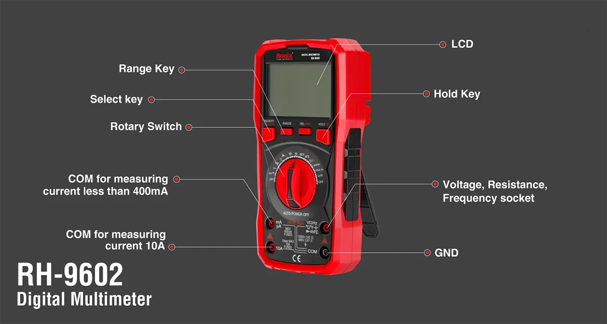 مهمترین فاکتور در خرید مولتی متر، دامنه اندازهگیری و تنوع پارامترهای قابل سنجش است. مدل RH-9602 رونیکس در این زمینه بسیار قدرتمند عمل میکند.