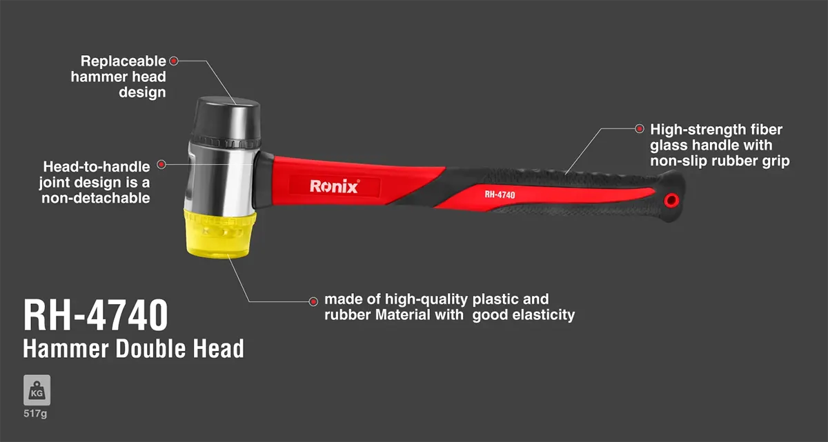 چکش فیبری رونیکس مدل RH-4740 یک ابزار مهندسی شده با وزن تقریبی 500 گرم (وزن دقیق 517 گرم) است که تعادل بسیار خوبی بین قدرت ضربه و کنترل پذیری ایجاد میکند. برخلاف چکشهای فلزی سنتی، این مدل دارای دو سری متفاوت است: یک سر از جنس لاستیک نرم و دیگری از جنس پلاستیک سخت. این ویژگی دوگانه به کاربر اجازه میدهد تا بسته به سختی سطح کار، سری مناسب را انتخاب کند. اتصال سری به بدنه با استفاده از رزین اپوکسی باکیفیت انجام شده که دوام اتصال را تضمین کرده و از لق شدن سری در طول زمان جلوگیری میکند.