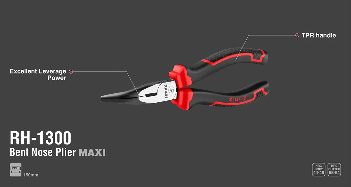 محصول RH-1300 رونیکس، یک انبر دم باریک با نوک خمیده (Bent Nose) است که در سایز استاندارد 6 اینچ (معادل تقریبی 150 تا 160 میلیمتر) تولید شده است. این ابزار دقیقاً برای زمانی طراحی شده که دم باریکهای مستقیم قادر به ایجاد زاویه مناسب برای گرفتن قطعه یا پیچاندن سیم نیستند. برند رونیکس در ساخت این مدل، استانداردهای بینالمللی GS و DIN را مد نظر قرار داده تا محصولی با طول عمر بالا ارائه دهد.