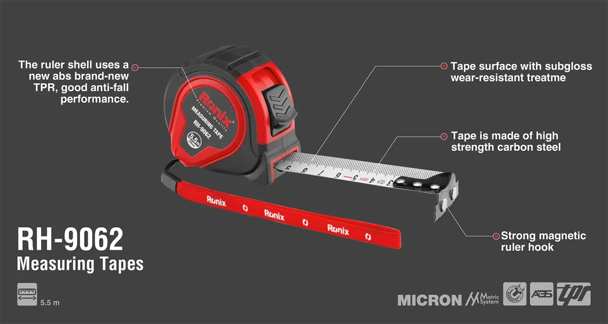 سری میکرون در محصولات رونیکس به ابزارهایی اشاره دارد که با تمرکز بر دقت بالا و متریال درجه یک تولید شدهاند. متر دستی مدل RH-9062 با بهرهگیری از کلاس دقتی II (استاندارد اروپا)، خطای اندازهگیری را به حداقل رسانده است. این محصول برای نجاران، نصابها، آهنگران و حتی کاربران خانگی که به دنبال ابزاری عمری هستند، طراحی شده است. طول 5.5 متری این متر، آن را به یک ابزار همهکاره تبدیل کرده که نه آنقدر کوتاه است که در اندازهگیری اتاقها دچار مشکل شوید و نه آنقدر سنگین که حمل آن دشوار باشد.