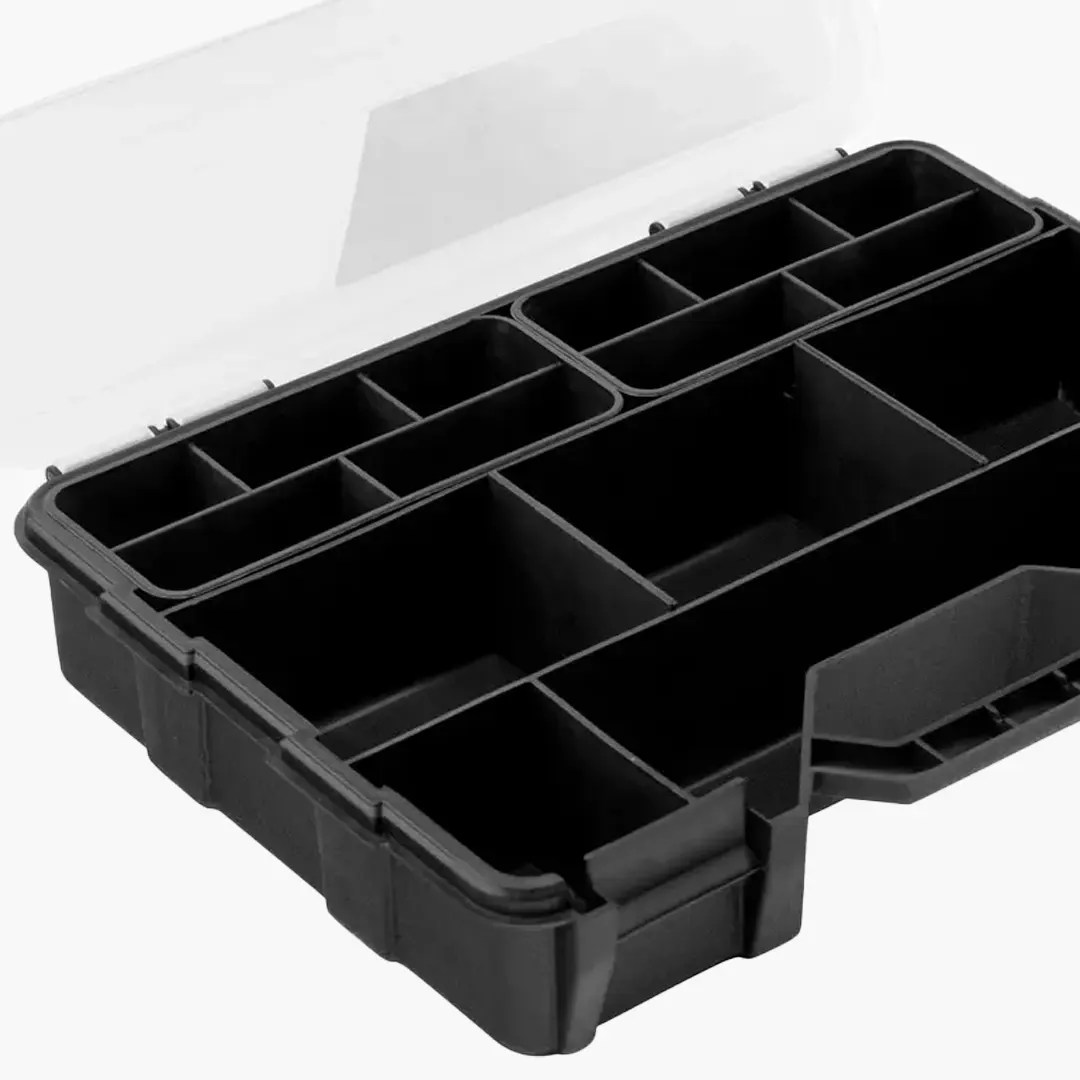 مهمترین ویژگی یک جعبه ابزار اورگانایزر، قابلیت تفکیکسازی آن است. فضای داخلی جعبه ابزار پلاستیکی رونیکس مدل RH-9128 به گونهای طراحی شده که دارای دیوایدرها (جداکنندهها)ی متحرک باشد. این یعنی شما محدود به ابعاد پیشفرض کارخانه نیستید. شما میتوانید بر اساس سایز قطعات خود (مانند طول متهها یا سایز پیچگوشتیهای کوچک)، تیغههای جداکننده را جابجا کرده و فضای داخلی را شخصیسازی کنید. این قابلیت برای کسانی که با قطعات متنوعی سروکار دارند، یک مزیت رقابتی بزرگ محسوب میشود.