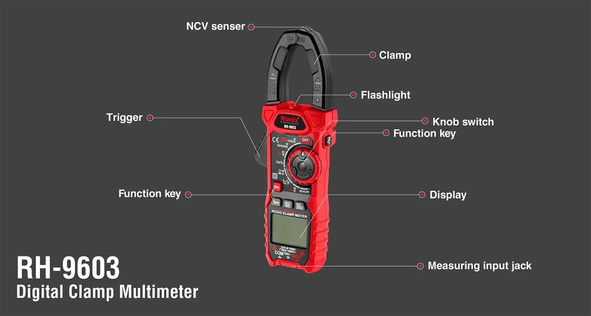 رونیکس در ساخت بدنه RH-9603 از پلاستیکهای مهندسیشده مقاوم استفاده کرده است تا در برابر ضربات احتمالی کارگاه دوام بیاورد. صفحه نمایش LCD این دستگاه با توانایی نمایش 6000 شمارنده (Count) و نور پسزمینه، خوانایی اعداد را در هر شرایط نوری تضمین میکند. همچنین چراغ قوه تعبیه شده در قسمت جلوی دستگاه، کار در تابلوبرقهای تاریک را آسان میکند.
