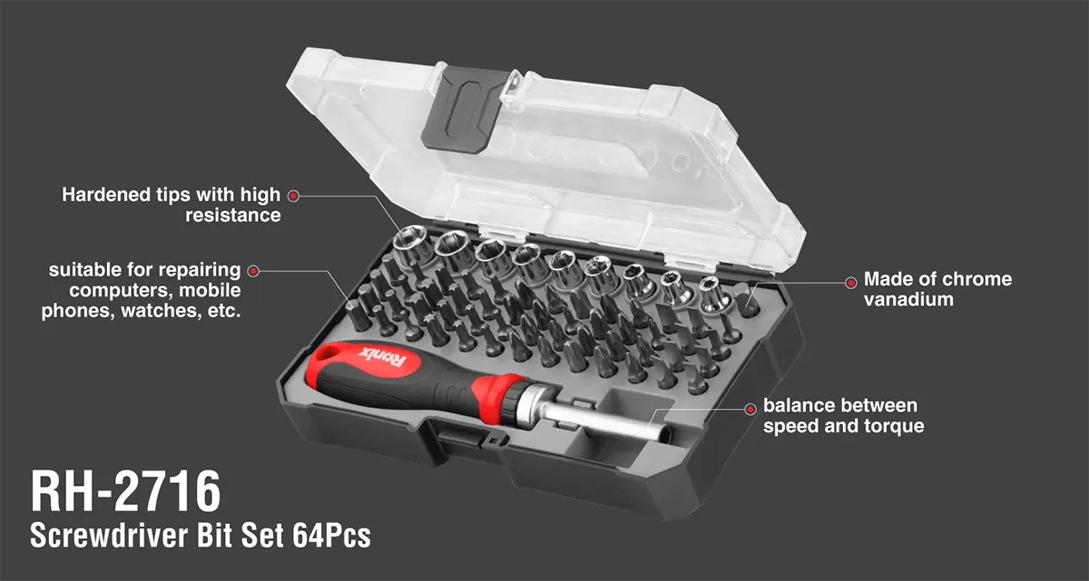 برگ برنده رونیکس در مدل RH-2716، استفاده از متریالهای مهندسی شده است. تمامی سریهای پیچگوشتی (Bits) از فولاد کروم وانادیوم ساخته شدهاند. برخلاف فولادهای کربنی معمولی، فولاد کروم وانادیوم تحت عملیات حرارتی سختکاری شده تا در برابر گشتاورهای بالا، دچار خوردگی یا شکستگی نشود. همچنین، سوکتها و رابطها از آلیاژ کروم وانادیوم (Cr-V) با روکش ساتن کروم ساخته شدهاند که مقاومت ۱۰۰ درصدی در برابر زنگزدگی و خوردگی دارند.